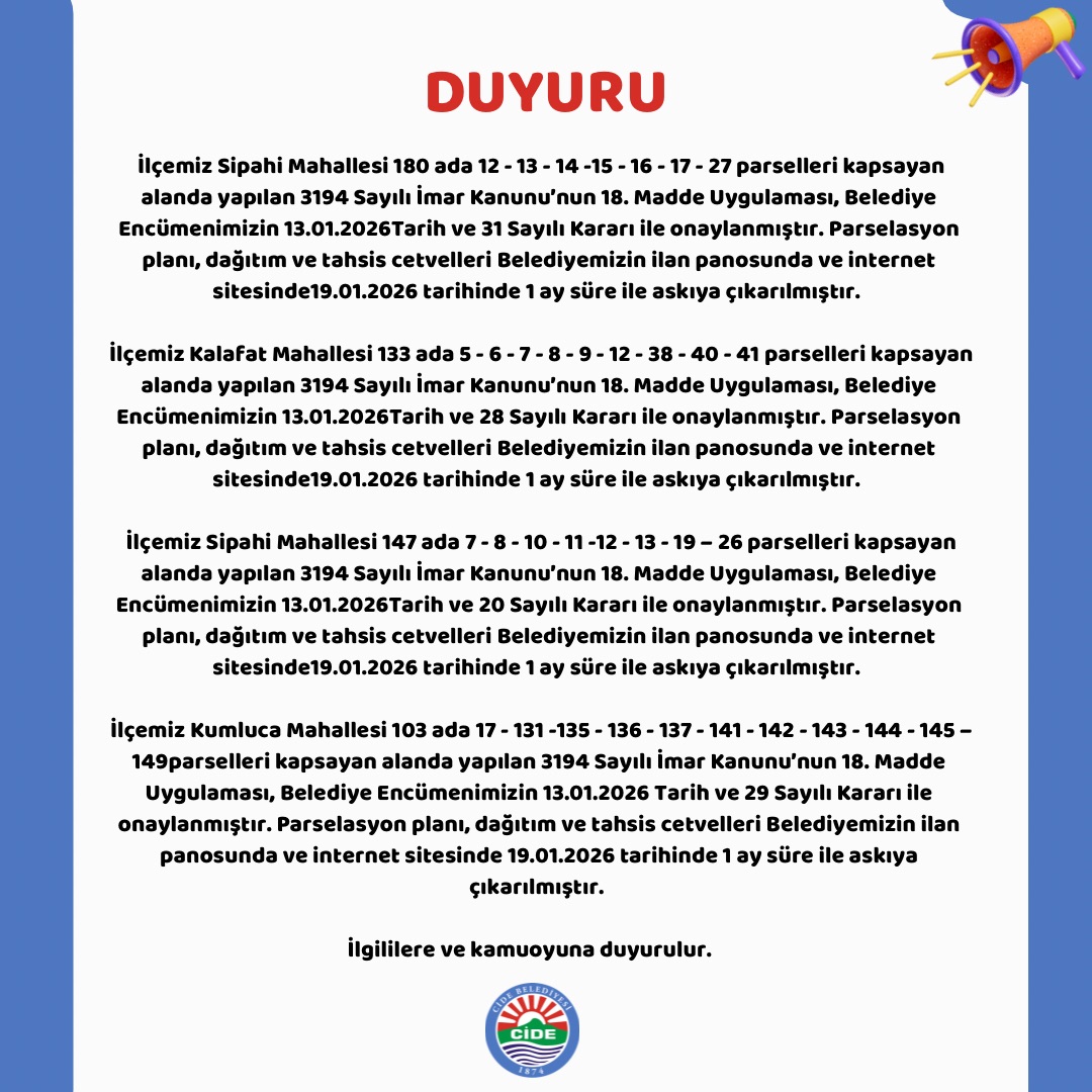 İlçemiz Sipahi Mahallesi 147 ada 7 - 8 - 10 - 11 - 12 - 13 - 19 – 26 parselleri kapsayan alanda yapılan 3194 Sayılı İmar Kanunu’nun 18. Madde Uygulaması, Belediye Encümenimizin 13.01.2026 Tarih ve 20 Sayılı Kararı ile onaylanmıştır. Parselasyon planı, dağıtım ve tahsis cetvelleri Belediyemizin ilan panosunda ve internet sitesinde 19.01.2026 tarihinde 1 ay süre ile askıya çıkarılmıştır.