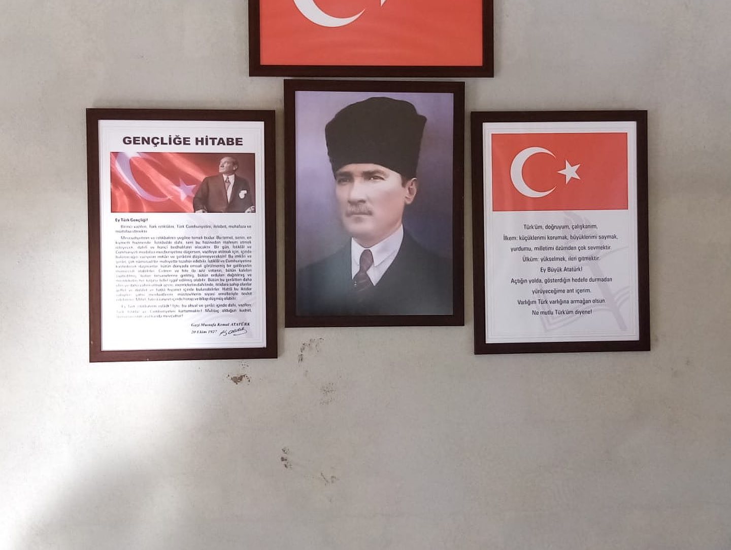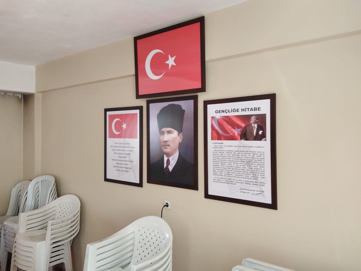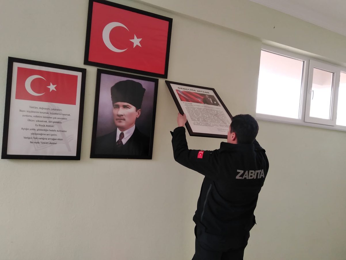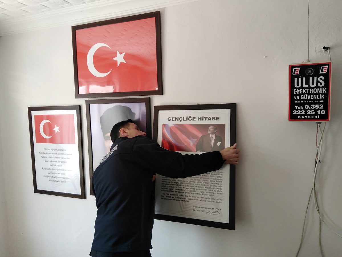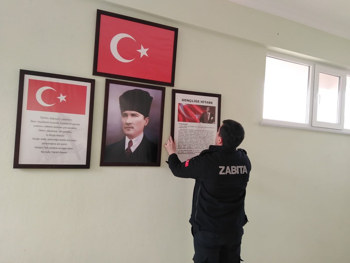 Belediyemiz ekipleri tarafından köy konaklarına, mahallelere bağlı toplanma alanlarına; eksik olan, yıpranan veya hiç bulunmayan Türk Bayrağı, Atatürk, Gençliğe Hitabe ve Andımız çerçevelerini temin ederek duvarlara asımını gerçekleştirdik.